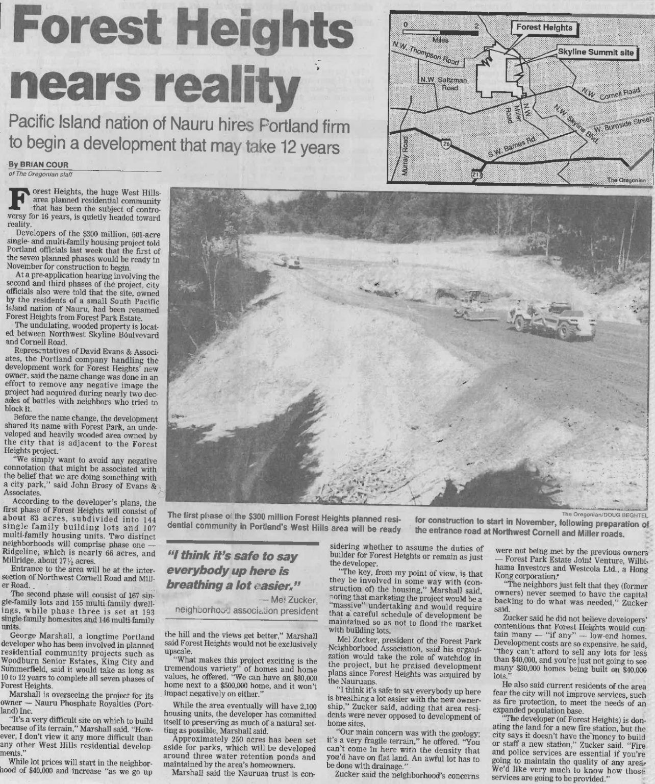Having caught their attention, Williams sold 601 acres of his land for $16 million to Nauru in 1988. Local developer, George Marshall was hired to develop, manage and sell the property. Having worked on many developments throughout Oregon, including Claremont, The Highlands at Gearhart, Charbonneau, Kings City, Summer Place and built over 2,000 single family homes, Marshall thought it was best to build Forest Heights as an extension to the neighborhoods that are known as the West Hills.